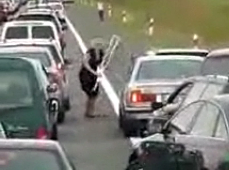 Nie od dziś wiadomo, że stanie w korku rodzi w ludziach frustrację. W takich warunkach wystarczy mała prowokacja i awantura gotowa. Ten kierowca nawet nie wiedział, ile ryzykuje, blokując innym pojazdom przejazd poboczem. Kobieta w samochodzie za nim po prostu nie wytrzymała napięcia...