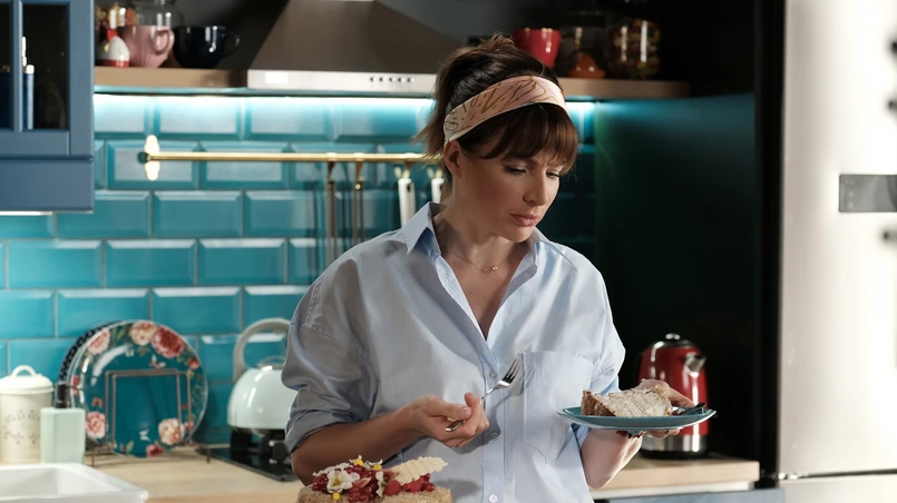 - Na szczęście byliśmy zajęci tym, co mamy grać, ale faktem jest, że pyszności było na planie dużo. Nie wszystkie nadawały się do jedzenia, bo niektóre miały funkcję użytkową - np. tort, którym rzucałam w Przemka Sadowskiego. Musiał być leciutki i bardzo miękki, żeby mu nie zrobić krzywdy - opowiada aktorka.